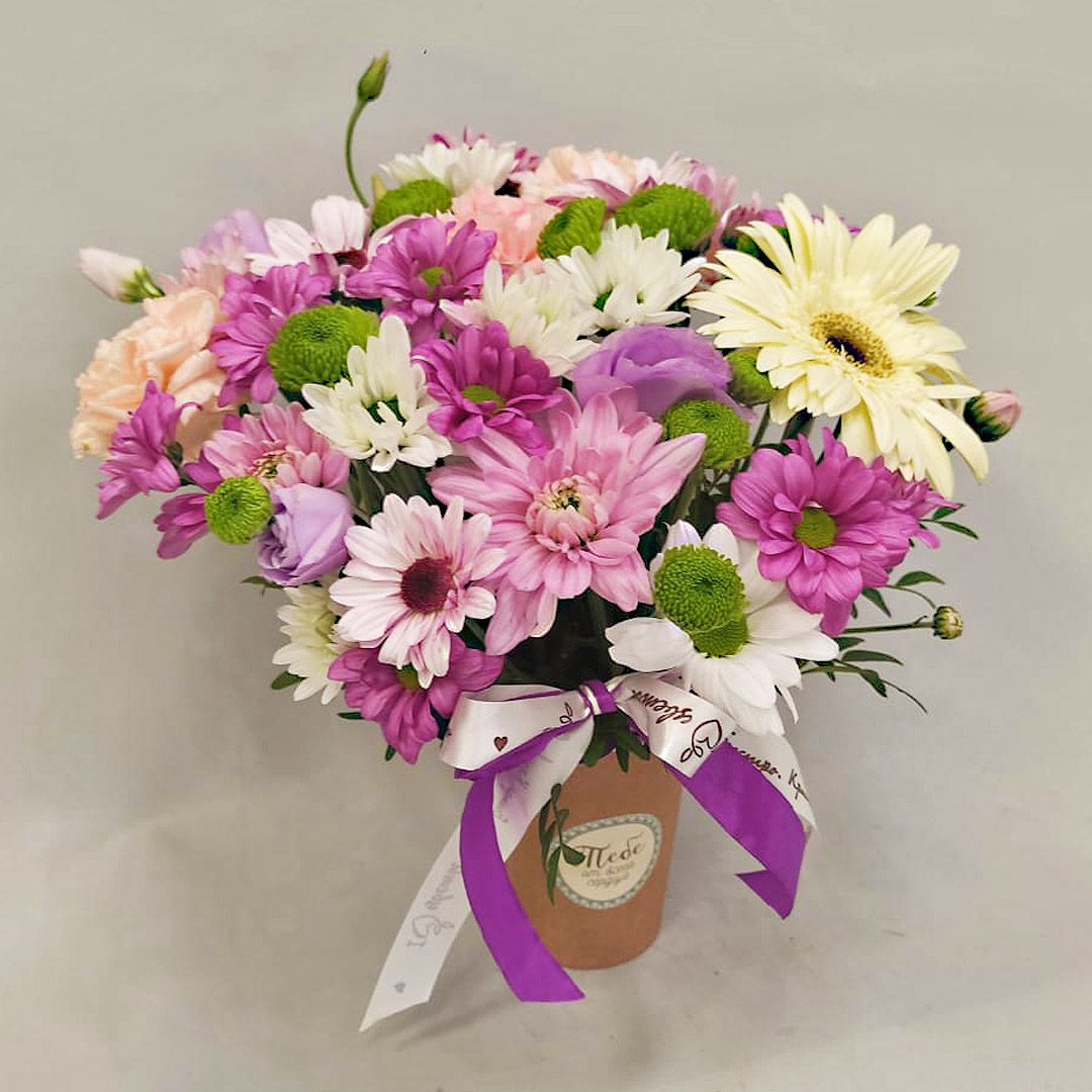 • Сумочка с цветами "Яркая" из кустовой хризантемы, роз и гербер арт. 42134