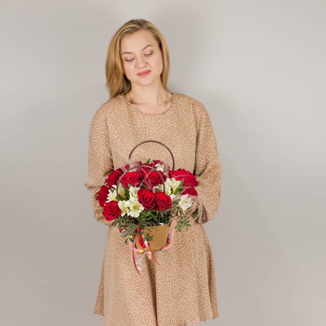 Сумка "Восторг" микс в красном цвете из кустовой хризантемы, розы и альстромерии арт. 45001