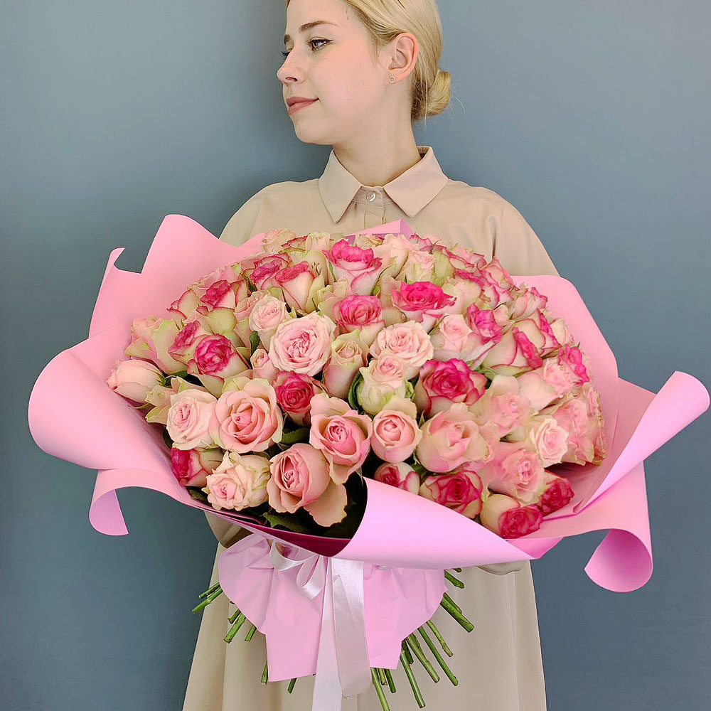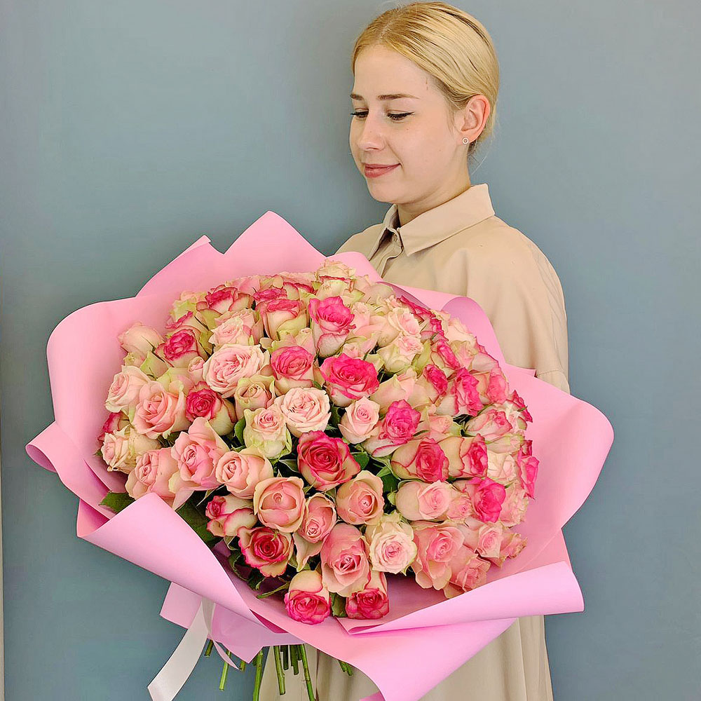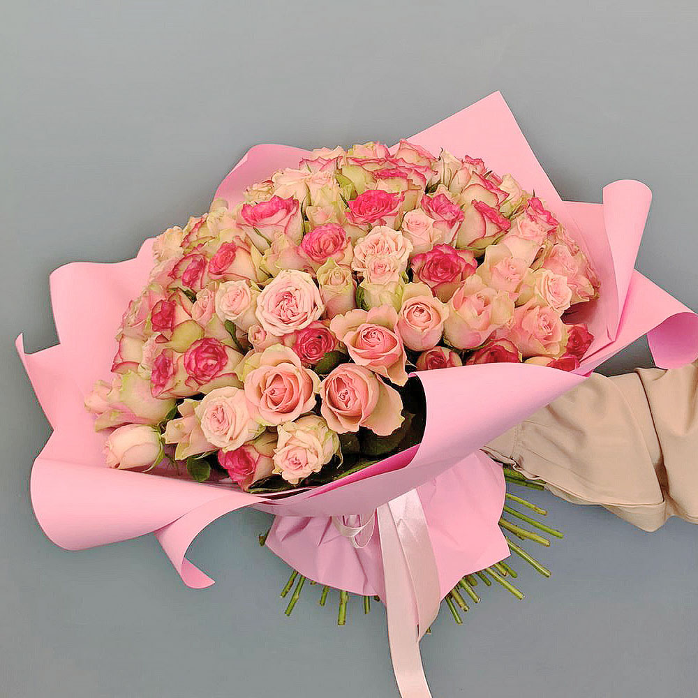 Такой розовый букет дарят маме, любимой, девушке или в знак благодарности, когда хочется удивить красиво и со вкусом. Моноформат выглядит солидно, но остаётся мягким по настроению - это тот случай, когда количество работает на эмоции. Плотная сборка делает букет выразительным, а разные тона роз добавляют глубину и теплоту.